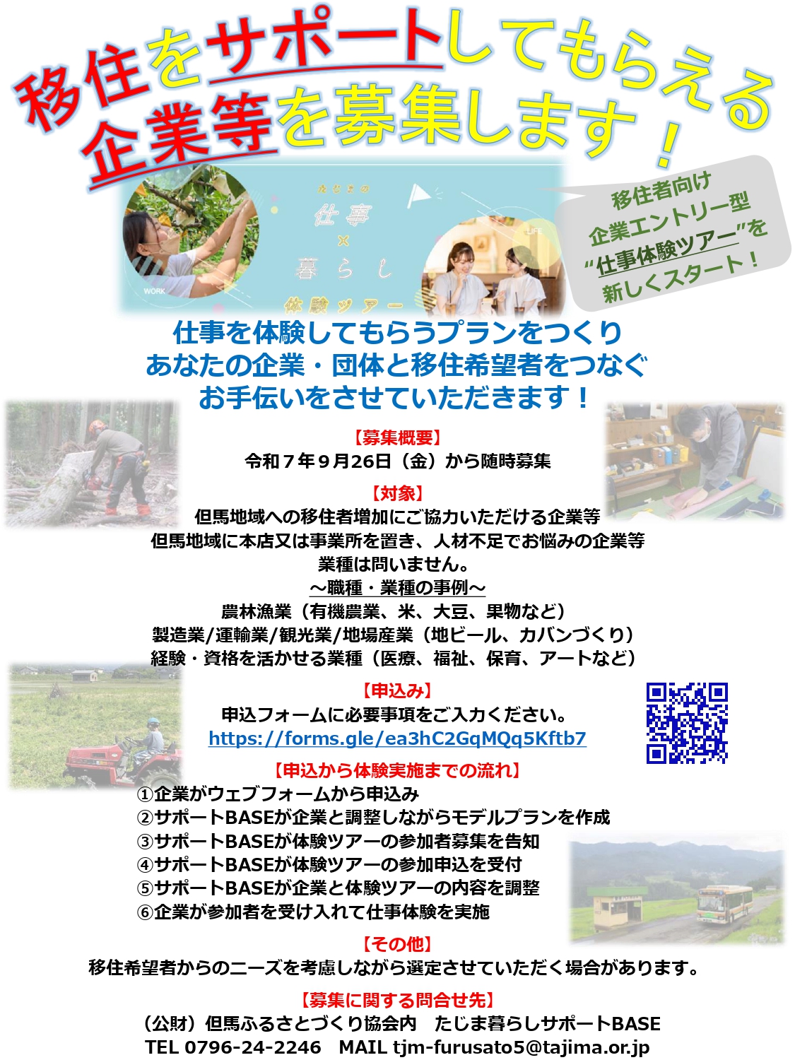 但馬への移住希望者と企業をつなぐ「たじま『仕事×暮らし』体験ツアー」では、移住者の仕事体験を受け入れてくださる企業・事業所を募集しています!